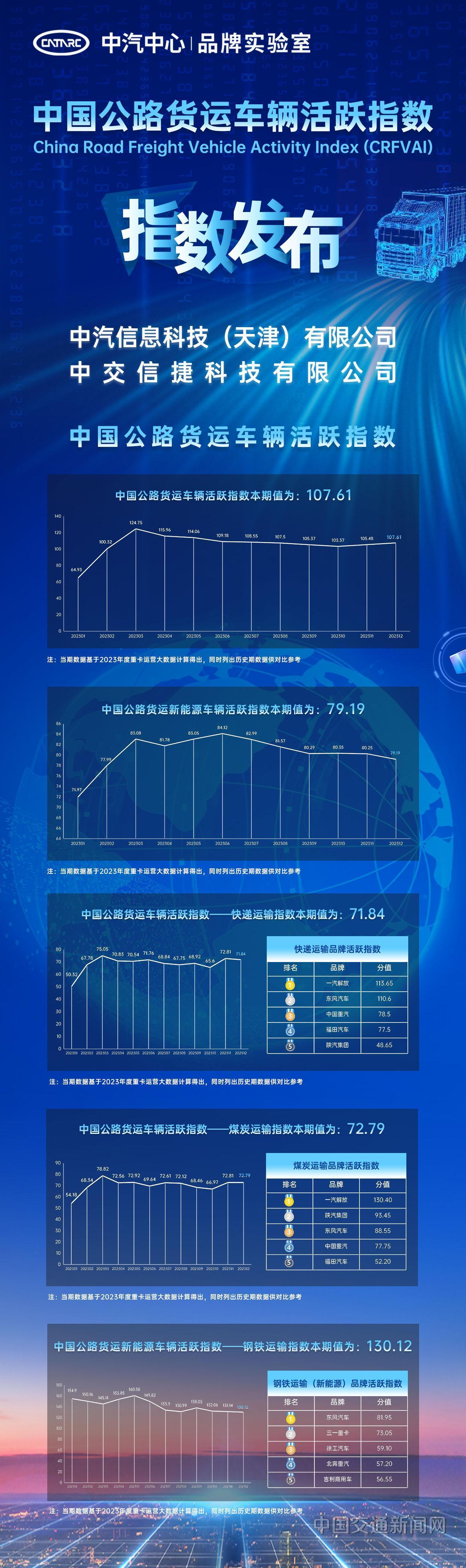 會(huì )上,中汽信息科技(天津)有限公司(簡(jiǎn)稱(chēng)中汽信科)聯(lián)合中交信捷科技有限公司發(fā)布2023年中國公路貨運車(chē)輛活躍指數,涵蓋貨車(chē)整體市場(chǎng)、新能源貨車(chē)市場(chǎng),并聚焦快遞、煤炭、鋼鐵(新能源)三類(lèi)細分市場(chǎng)。中汽信科前瞻業(yè)務(wù)部部長(cháng)王文斌還發(fā)布了品牌活躍度指數榜單。
